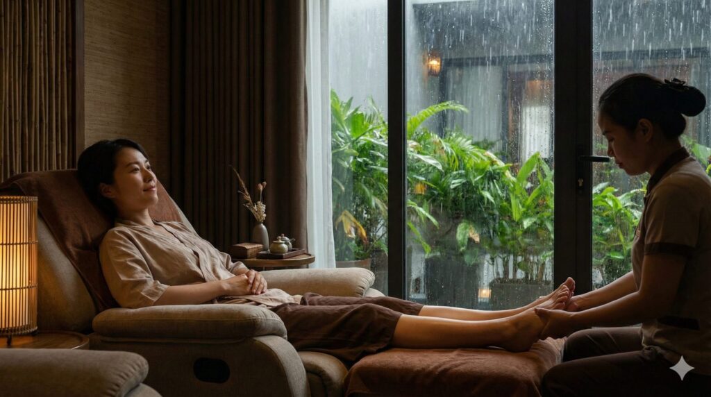 - メニューの選び方: 雨で身体が冷えている時は、「ホットストーンマッサージ」や「ハーバルボール」が特におすすめです。芯から温まりますよ。