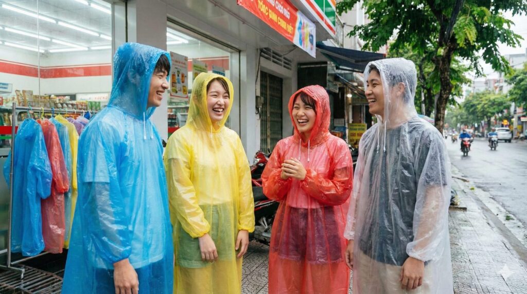 最後に、ダナンの雨と戦うための最強アイテム「ポンチョ」について熱く語らせてください。日本から高品質な折りたたみ傘を持参される方も多いですが、ダナンのスコールは強風を伴うことが多く、傘は「役に立たない」ケースが多々あります。横殴りの雨で下半身はずぶ濡れ、傘は裏返って骨が折れる…なんて悲劇は避けたいですよね。