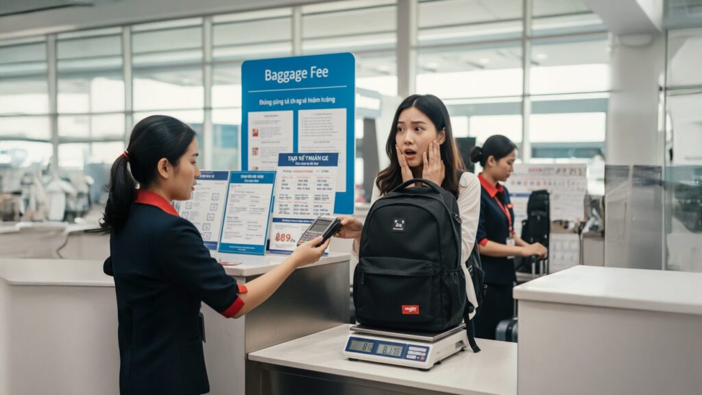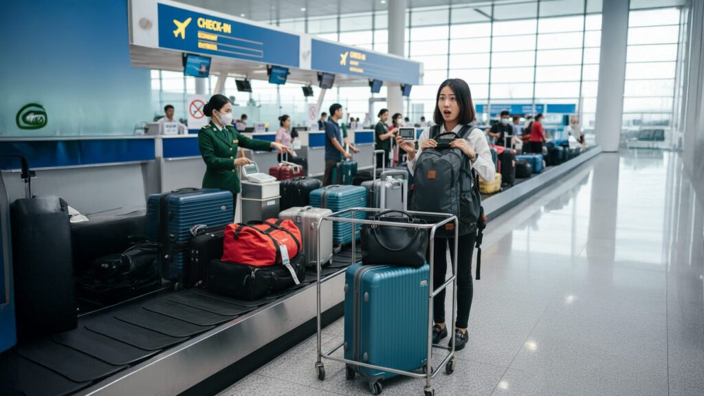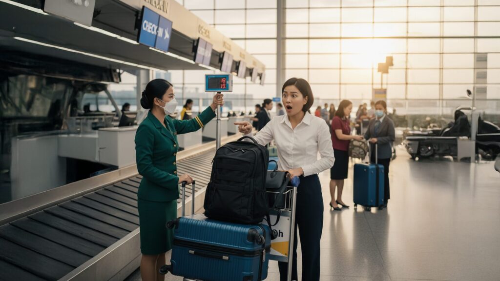 この場合、チェックインカウンターに戻る時間はないため、その場で「出発ゲートでの受託手荷物取り扱いサービス」として、500,000ドン(約3,000円)や、それ以上の非常に高額な手数料をその場で請求されます。これは定時運航を妨げる行為とみなされるため、一種の罰金的な意味合いも含まれます。0.1kgの超過で数千円の出費となる最悪のシナリオです。