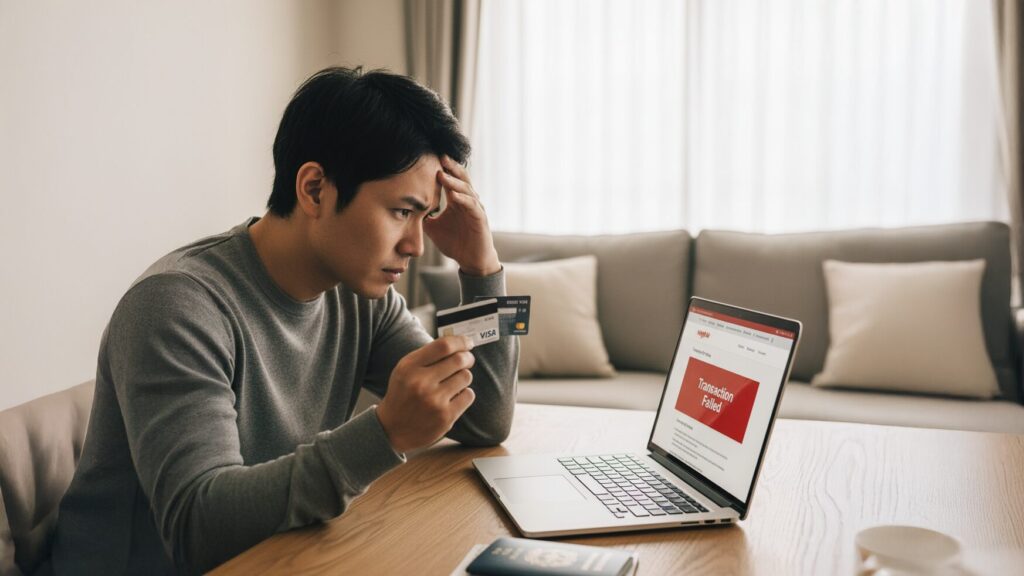「Transaction failed」や「Tu choi thanh toan(ベトナム語で支払い拒否)」などのエラーが表示され、決済が完了しない問題です。特にアメリカン・エキスプレス(AMEX)カードで発生しやすいとの報告があります。