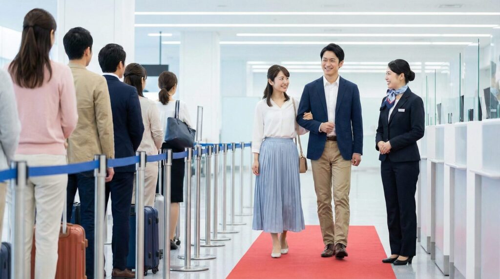みんなが1時間並んでる横を、10分とか15分で通過できるんで、まさに「時間を金で買う」サービス。数千円〜1万円くらいかかるけど、乗り遅れるリスクと疲労を考えたら、安い投資だと思いますよ。